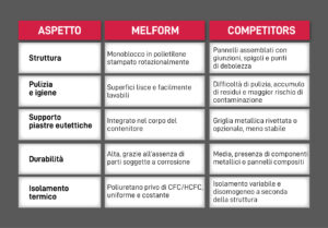 Confronto con i competitor: La differenza si traduce in prestazioni reali: maggiore affidabilità, minore manutenzione e una vita utile significativamente più lunga. Ogni CARGO è testato singolarmente dal nostro Ufficio Qualità per garantire la conformità alle normative ATP e agli standard sanitari più severi. La scelta di materiali riciclabili e processi produttivi a basso impatto ambientale contribuisce a un modello di logistica più sostenibile, senza compromessi sulle prestazioni. I contenitori isotermici MELFORM sono realizzati con materiali riciclati e riciclabili, garantendo un ciclo di vita sostenibile e riducendo gli sprechi. Tutti i nostri contenitori, alla fine della vita operativa, vengono riciclati per dare vita a nuovi prodotti — un impegno concreto verso l’economia circolare.   In sintesi Un contenitore isotermico MELFORM non è solo un prodotto, ma una soluzione ingegnerizzata: