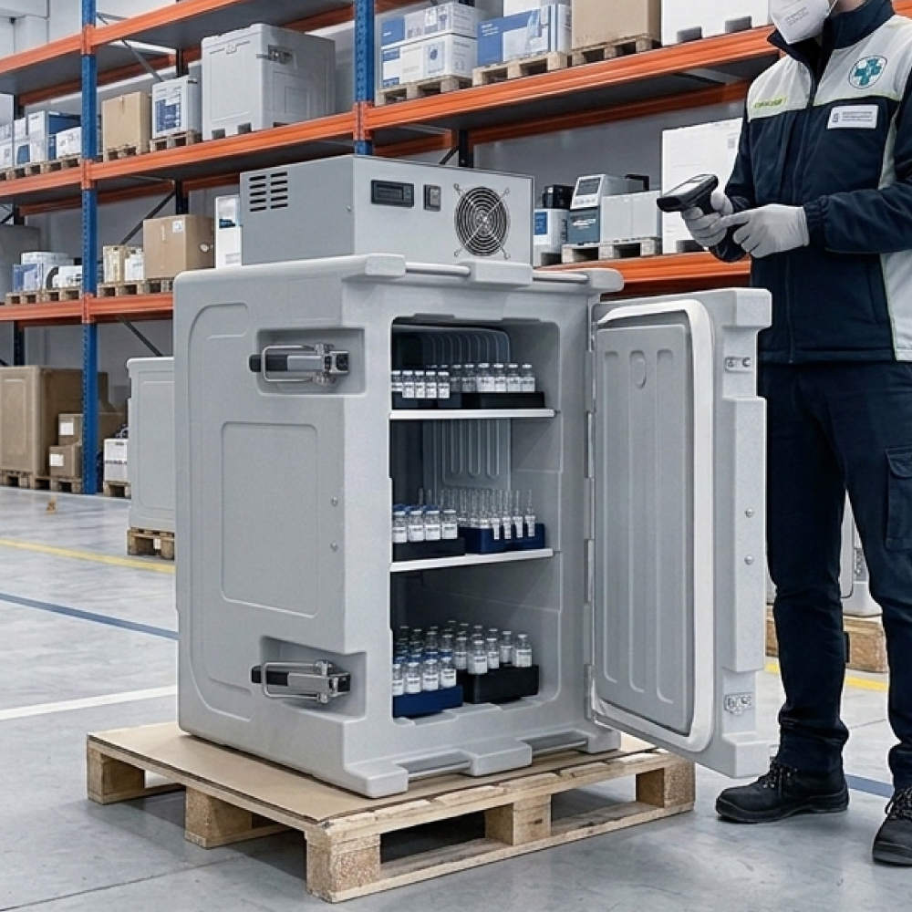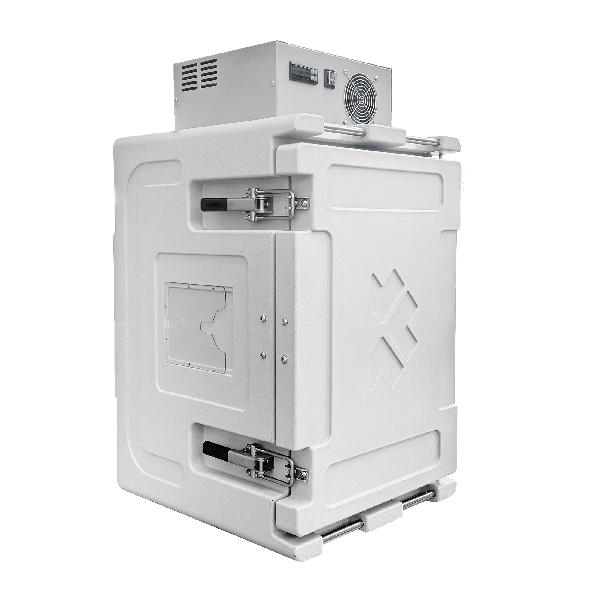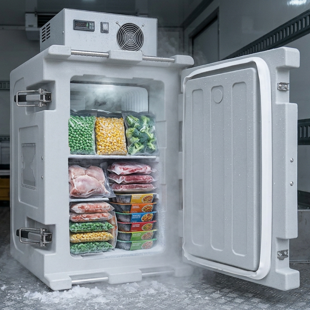 Contenitore refrigerato mobile progettato per il trasporto di prodotti a temperatura controllata, con capacità utile di 86 litri. La struttura è realizzata in polietilene per uso alimentare mediante stampaggio rotazionale, che garantisce elevata resistenza meccanica, assenza di giunzioni e lunga durabilità nel tempo. L’isolamento è ottenuto tramite schiuma poliuretanica ad alta densità, priva di CFC e HCFC, che assicura un’ottima inerzia termica e ridotte dispersioni. Il sistema di refrigerazione è costituito da un gruppo frigorifero statico con evaporatore tipo “roll-bond” e termostato digitale programmabile, che consente il controllo attivo della temperatura nel range -25°C / +40°C. Il gruppo frigorifero è disponibile in configurazione sul tetto o sul dorso, per una maggiore flessibilità di installazione. Il sistema è alimentato tramite doppia alimentazione 12Vdc / 230Vac, rendendo il contenitore idoneo sia per utilizzi mobili che stazionari.